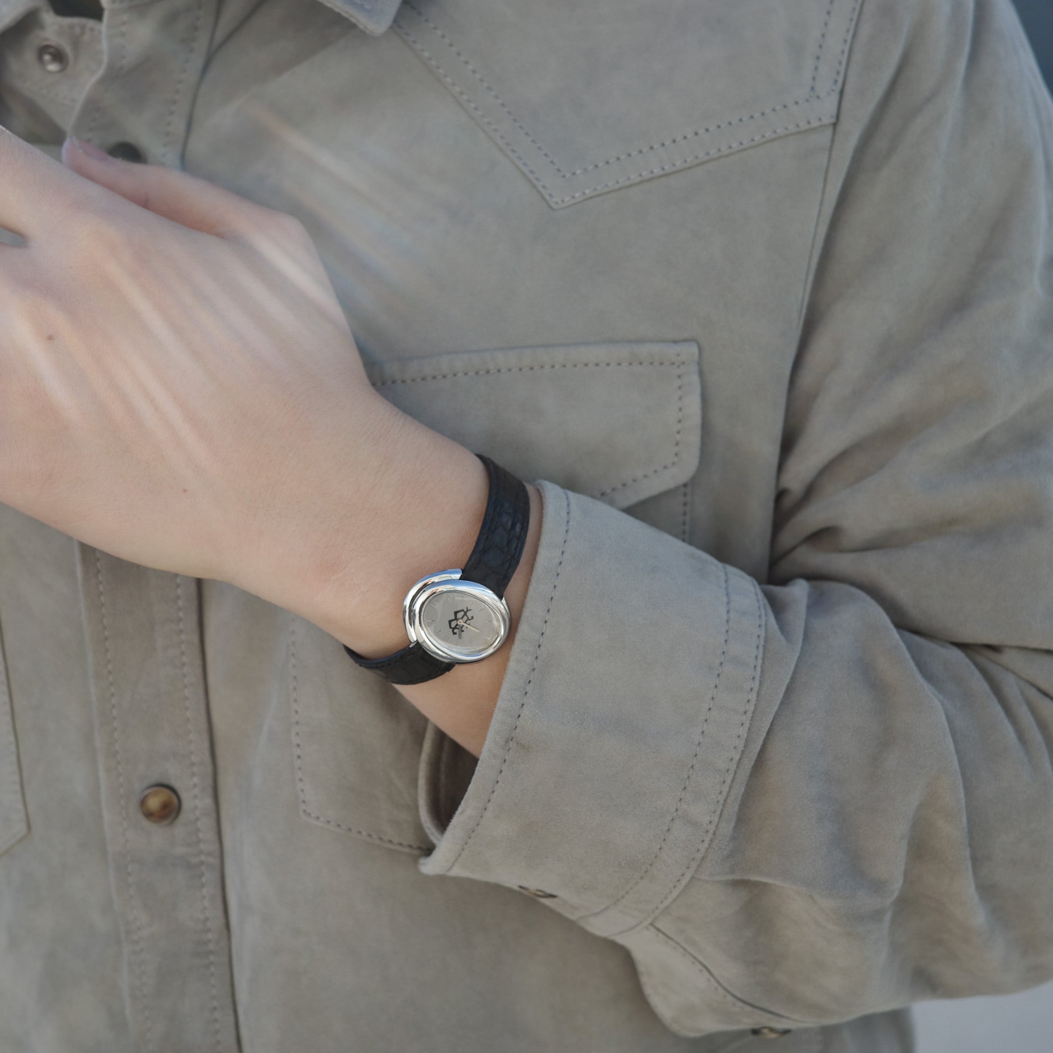 こちらはベルトを脱着する際にハンターケースの用にケースを開け閉めしてベルトを装着する特殊な機構となっております、故に竜頭やベルトの接続部分が見えない造りになっており、ドレッシーな仕上がりになっております。